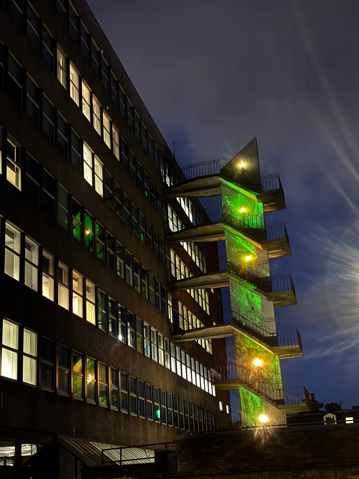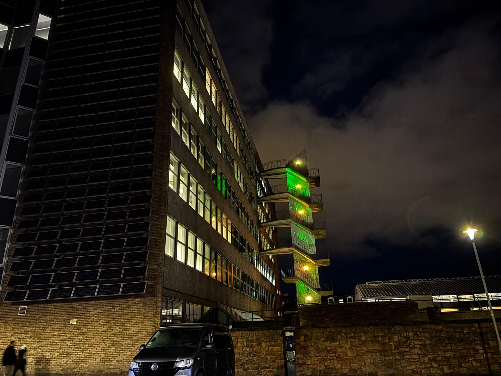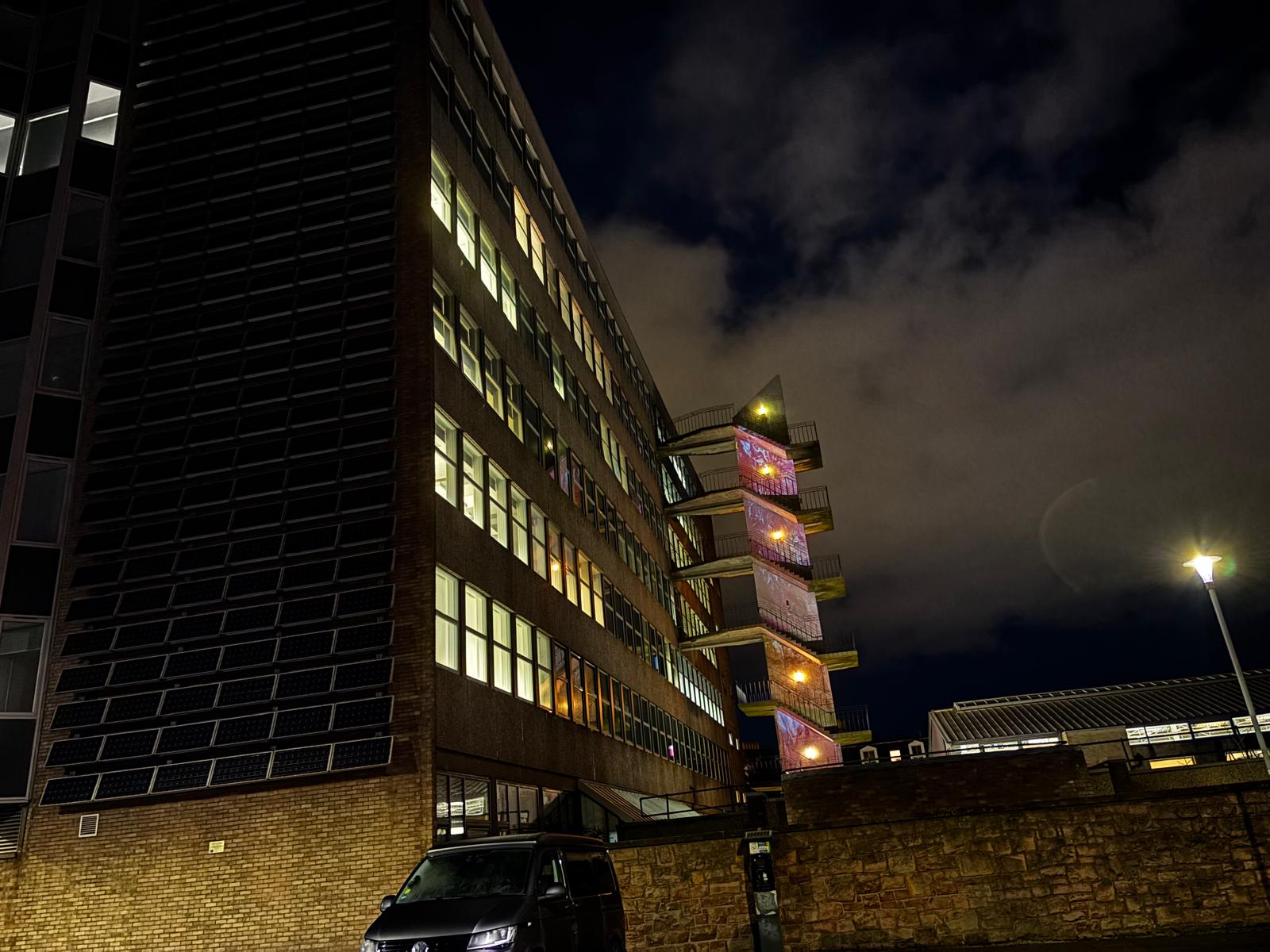 In January 2026 we projected one of our videos in vertical repetition on the side of Edinburgh Napier University.